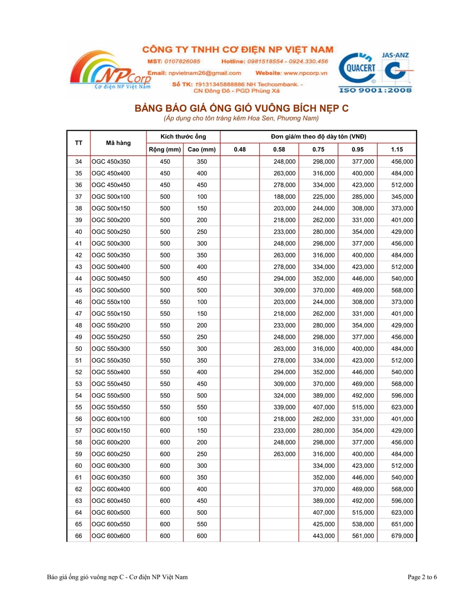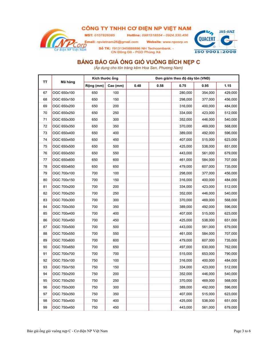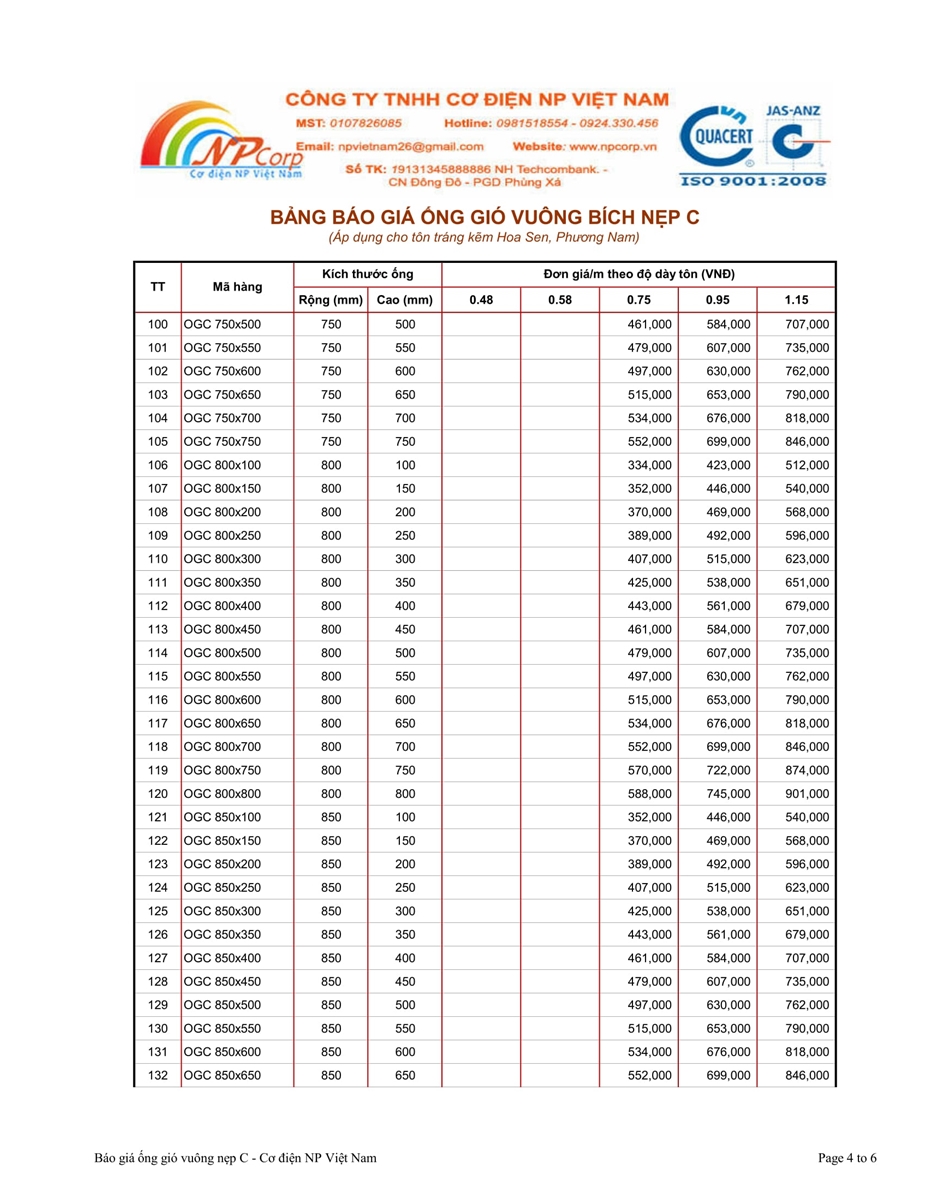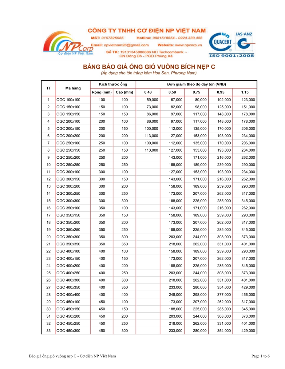 Linkdown: BẢNG BÁO GIÁ ỐNG GIÓ VUÔNG BÍCH NẸP C GIÁ RẺ HÀ NỘI