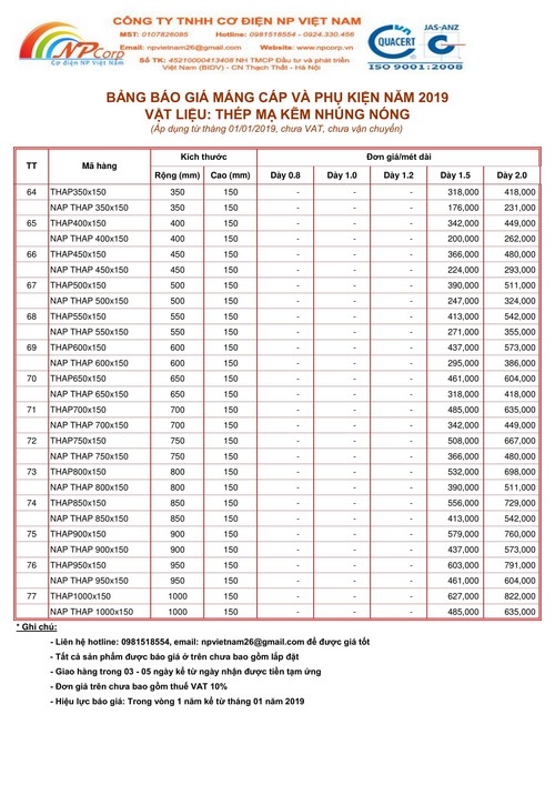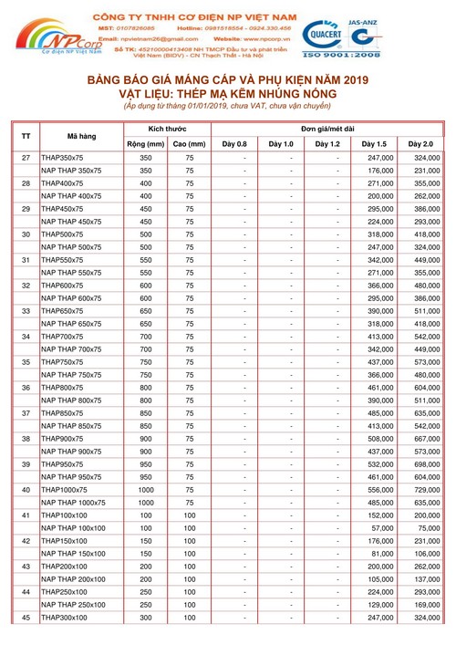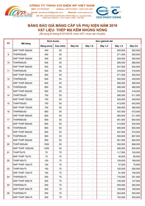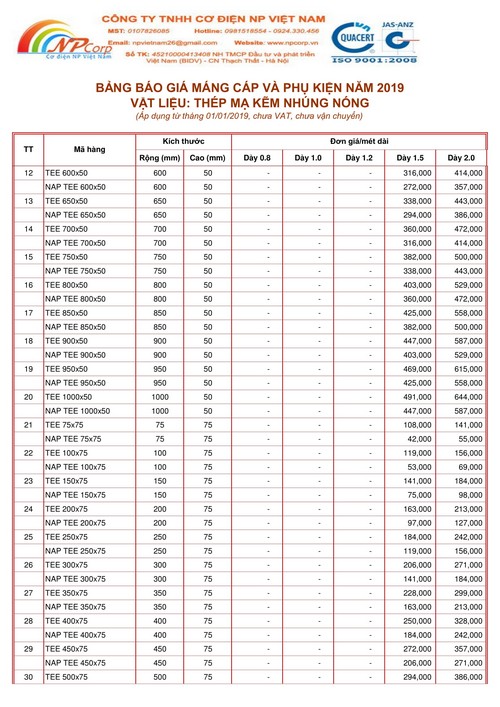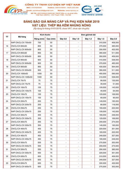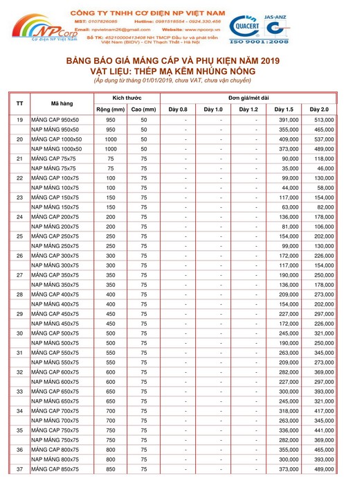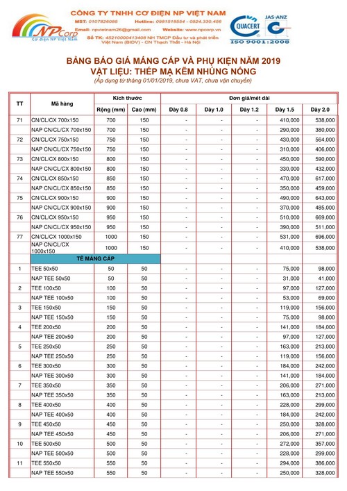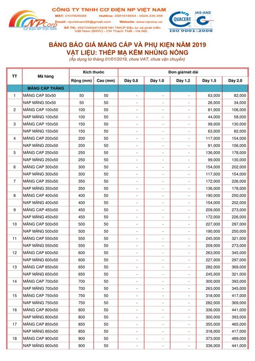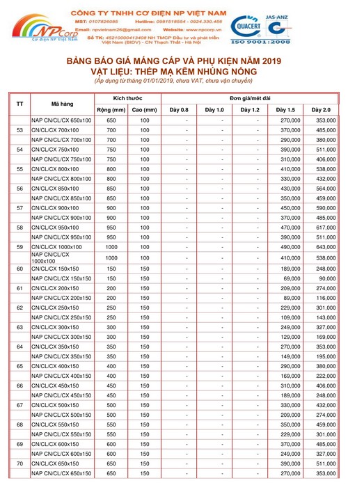 - Bảng báo giá máng cáp và phụ kiện mạ kẽm nhúng nóng 2019