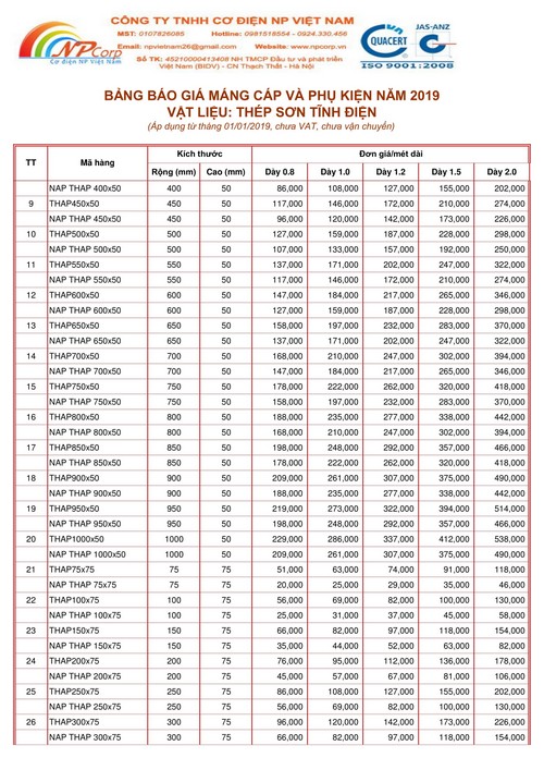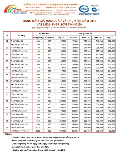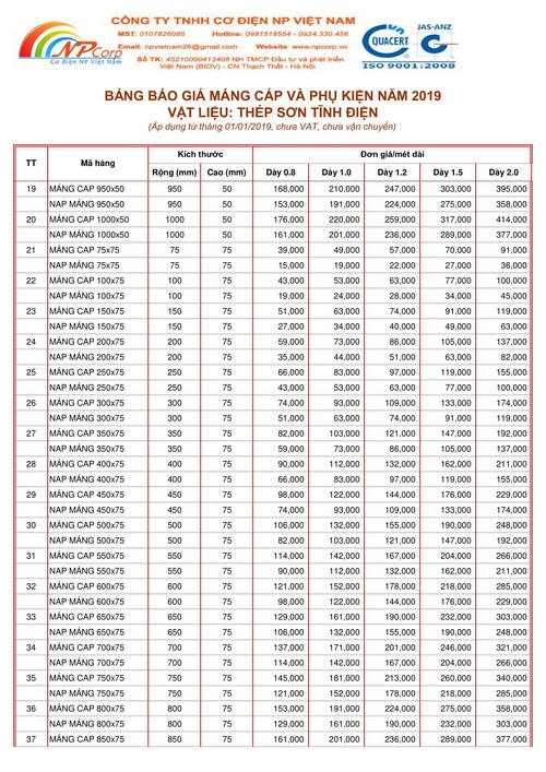 Để giúp khách hàng thuận tiện trong quá trình làm dự toán công trình, Cơ điện NP xin gửi tới quý khách hàng bảng báo giá máng cáp và phụ kiện sơn tĩnh điện năm 2019 mà chúng tôi đã thực hiện cho các dự án tại Hà Giang.