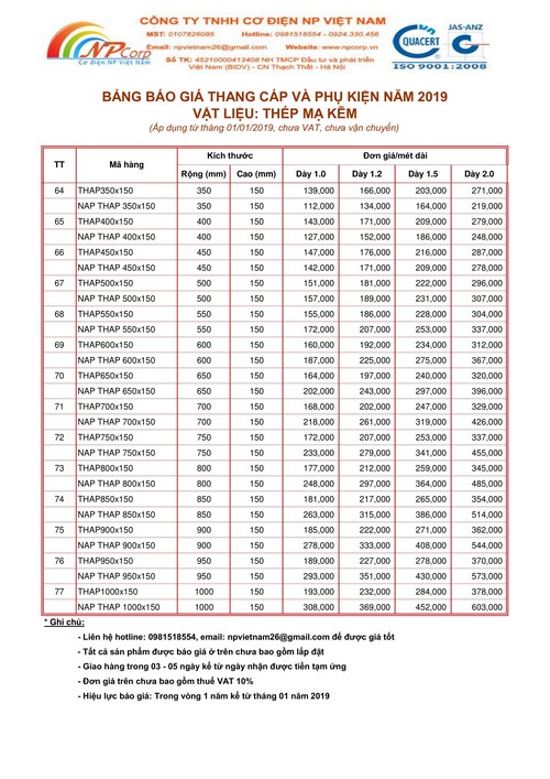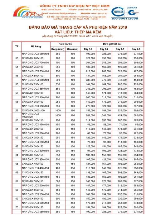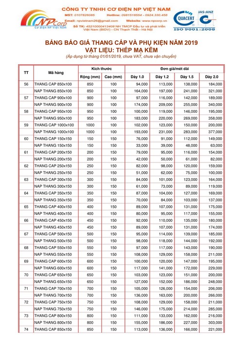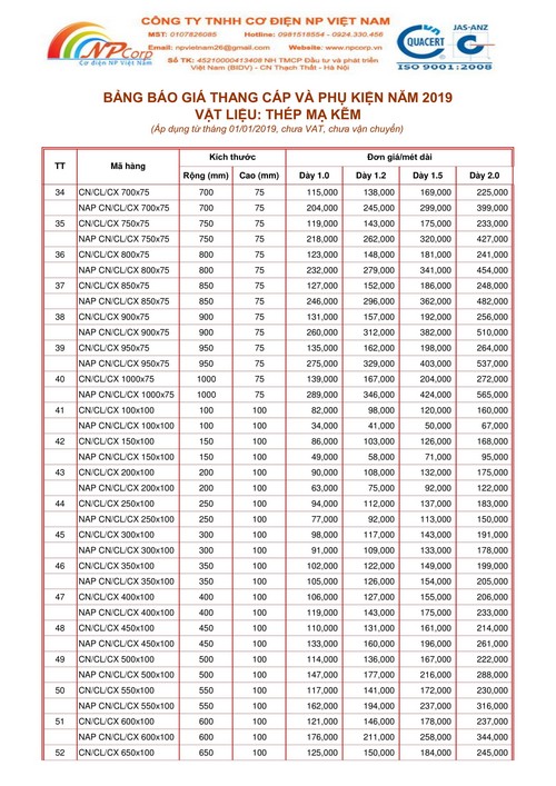Công ty TNHH Cơ Điện NP Việt Nam xin gửi tới Quý Khách Hàng Bảng giá thang cáp mạ kẽm và phụ kiện 2019 cập nhập mới nhất vào ngày 01 tháng 01 năm 2019.