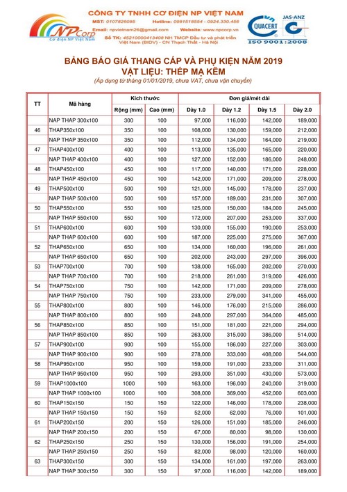 - Bảng báo giá thang cáp và phụ kiện mạ kẽm nhúng nóng 2019
