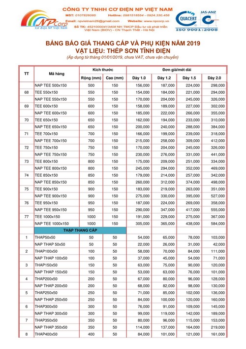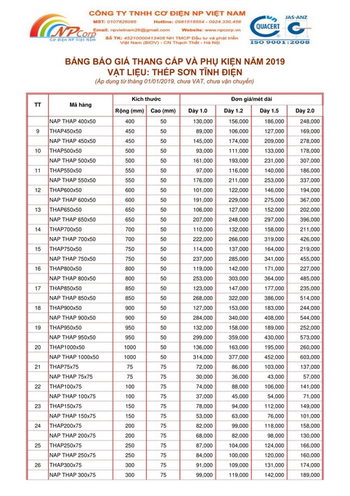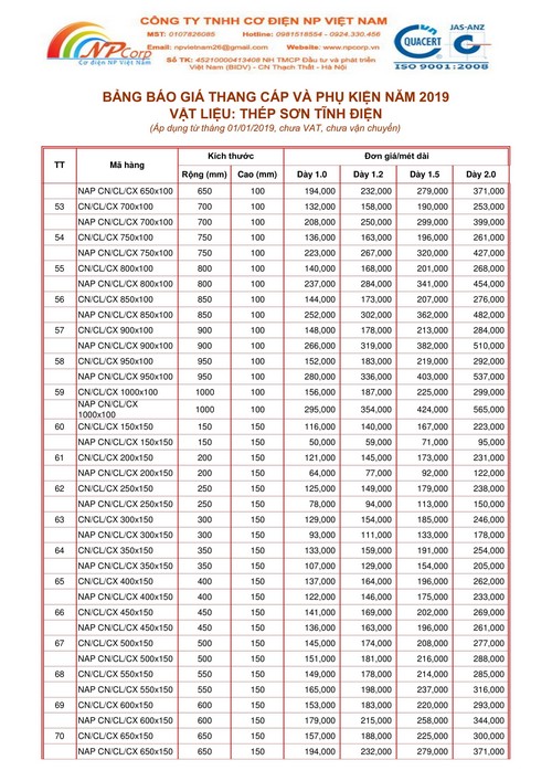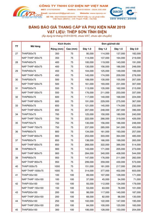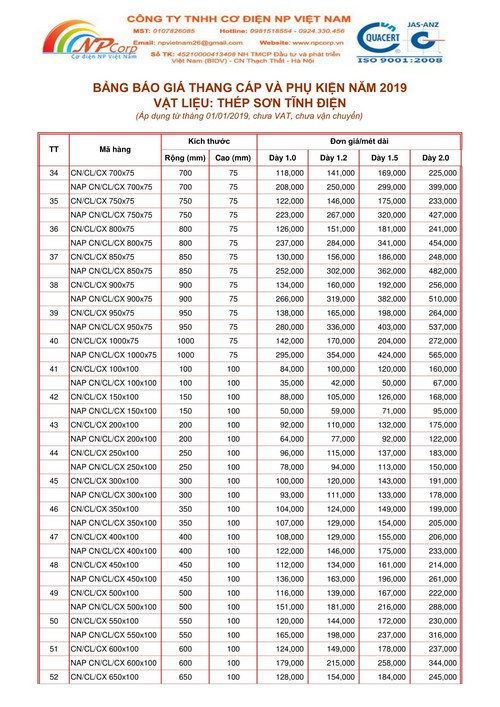 Công ty TNHH Cơ Điện NP Việt Nam xin gửi tới Quý Khách Hàng Bảng giá Thang cáp và phụ kiện sơn tĩnh điện 2019 cập nhập mới nhất vào ngày 01 tháng 01 năm 2019.