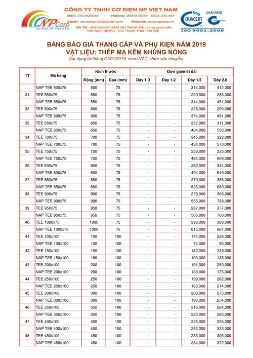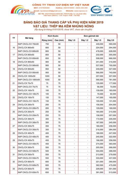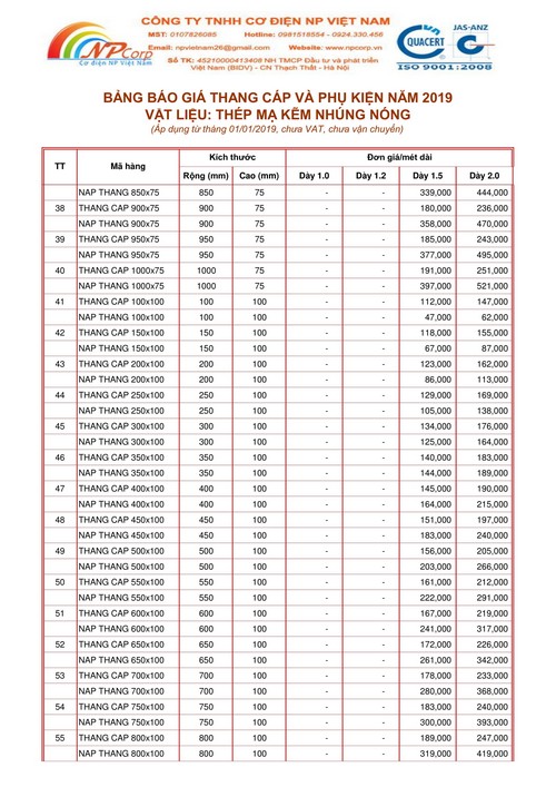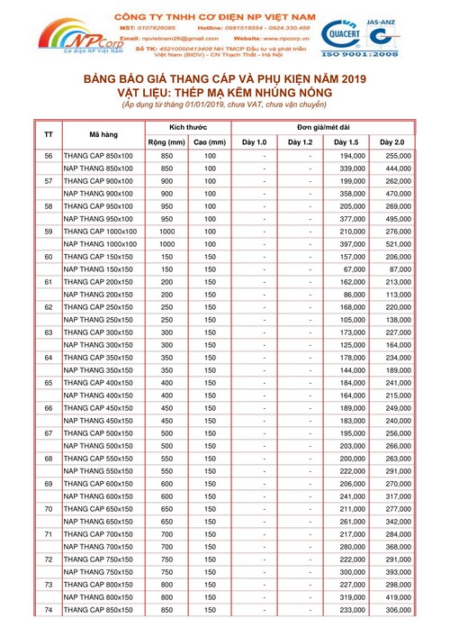 Để tiện cho Quý khách hàng dự toán công trình, Cơ điện NP Việt Nam xin gửi Quý khách hàng Bảng báo giá thang cáp và phụ kiện mạ kẽm nhúng nóng 2019