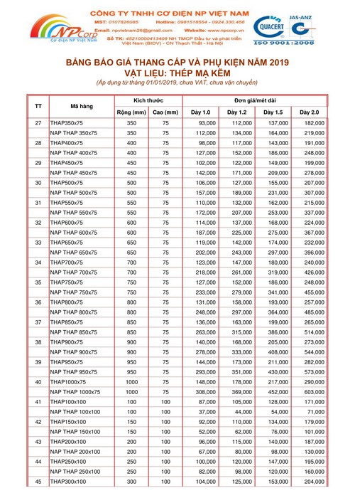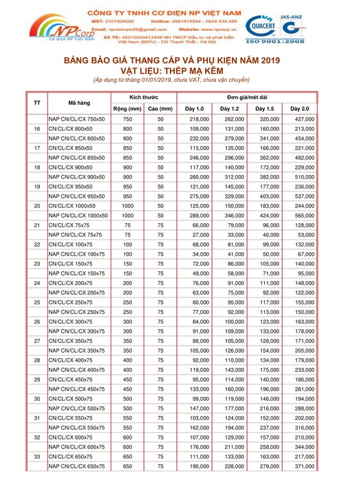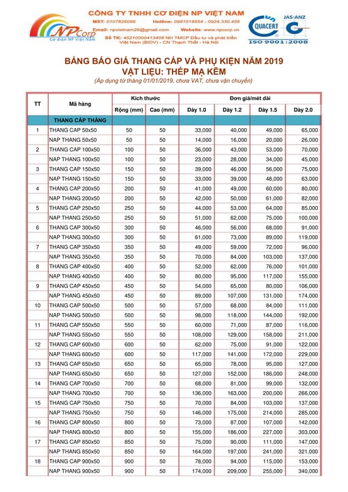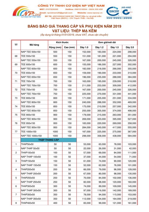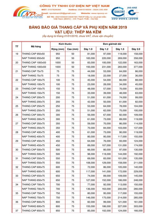 Cơ điện NP xin gửi Quý khách hàng Bảng báo giá thang cáp mạ kẽm và phụ kiện 2019 dưới đây:
